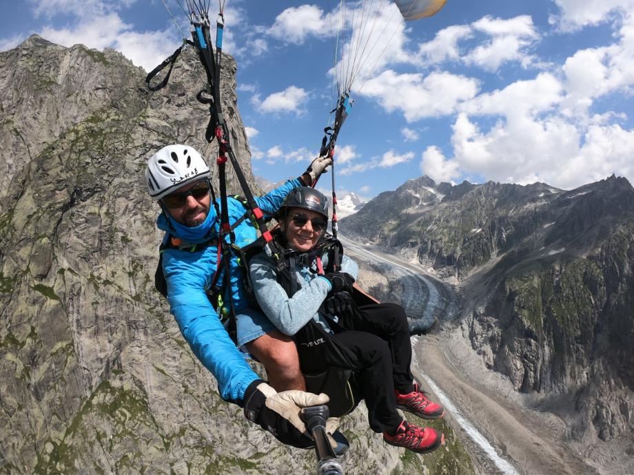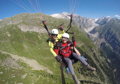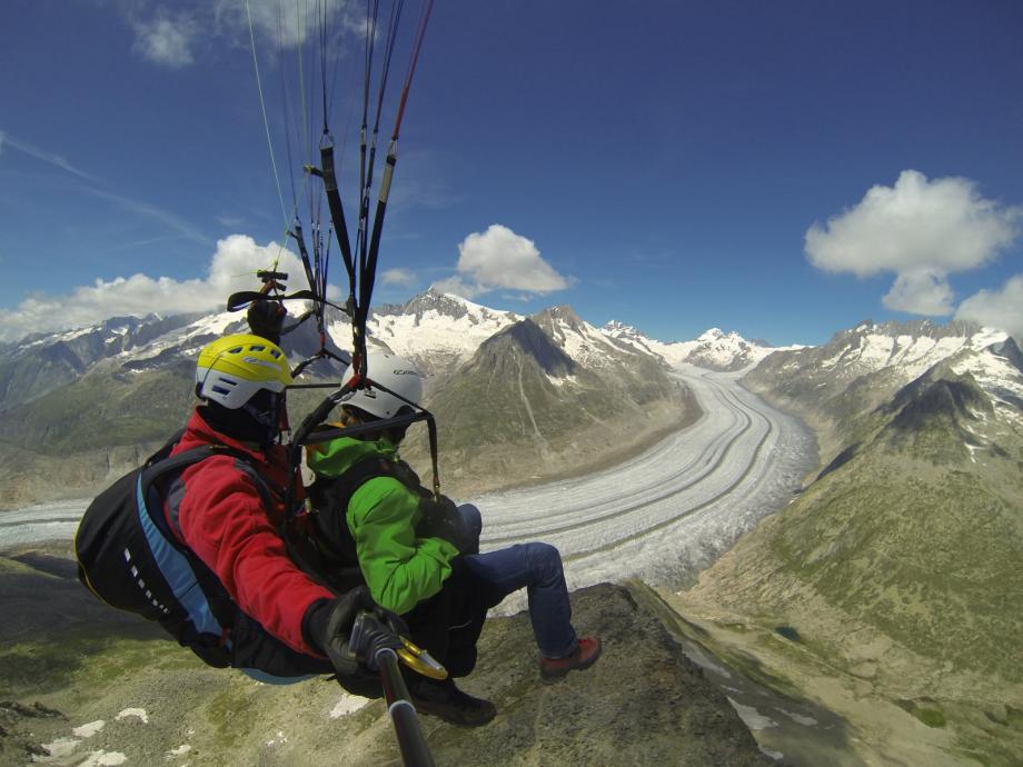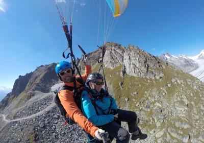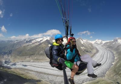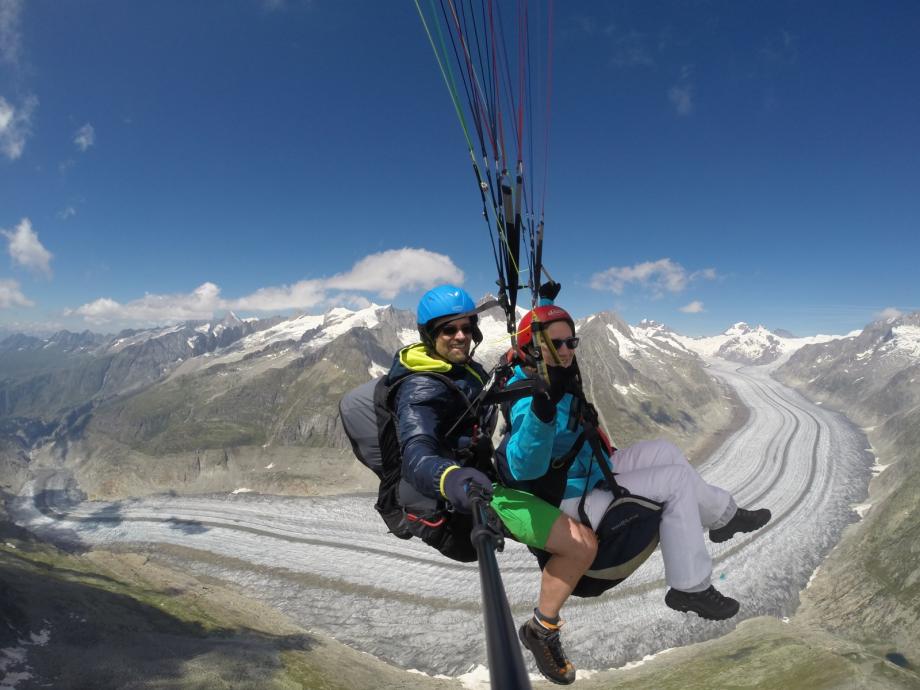 Un vol à couper le souffle pour les deux en même temps au-dessus de l'Aletsch Arena garantit une expérience d'un genre très particulier. Mais le vol commun ne suffit pas. Immédiatement après l'atterrissage, l'équipe de pilotes s'efforce de ne pas laisser s'échapper la complicité. Après une coupe de champagne sur le lieu d'atterrissage, nous vous conduirons à l'hôtel wellness où vous pourrez encore profiter de moments en commun et passer en revue cette expérience de vol libératrice autour d'un dîner.